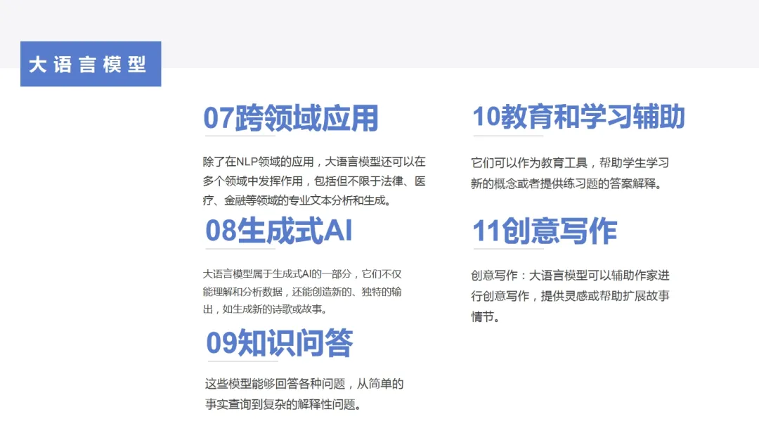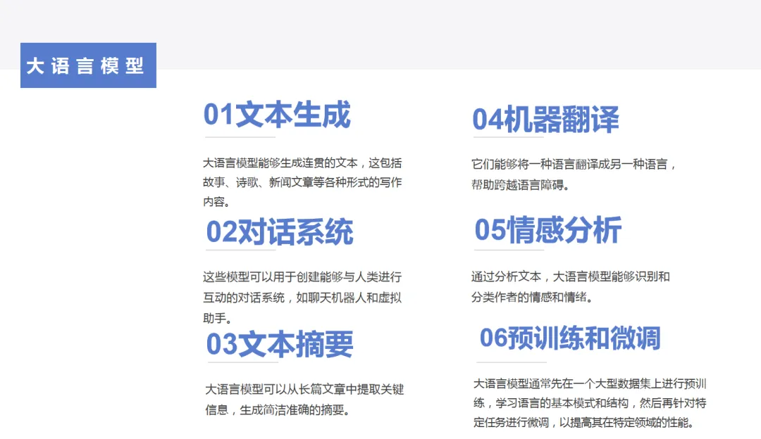 大语言模型(LLM)是一类先进的人工智能模型,它们在自然语言处理(NLP)领域展现出了卓越的能力。以下是大语言模型的一些主要功能: