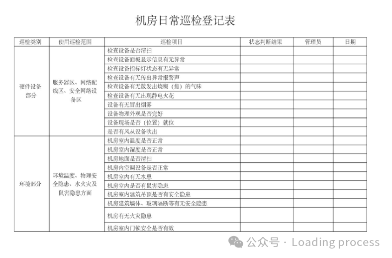 记录表格应包含巡检时间、巡检人员、设备名称、设备位置、巡检项目、巡检结果、异常情况描述及处理措施等字段。例如,对于一台服务器的巡检记录,需详细记录CPU温度、内存使用量、硬盘读写次数等具体数据。