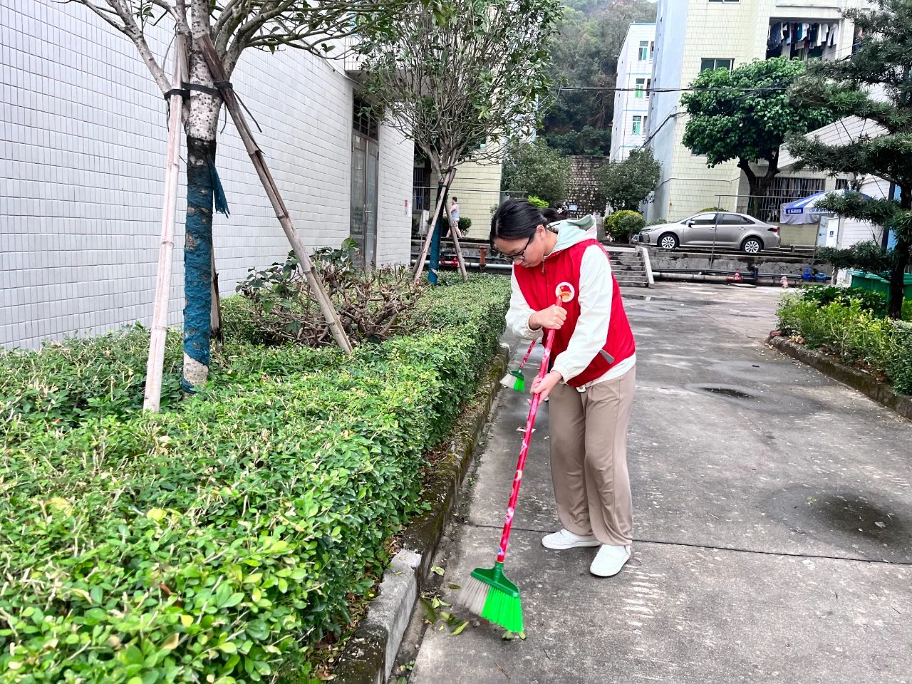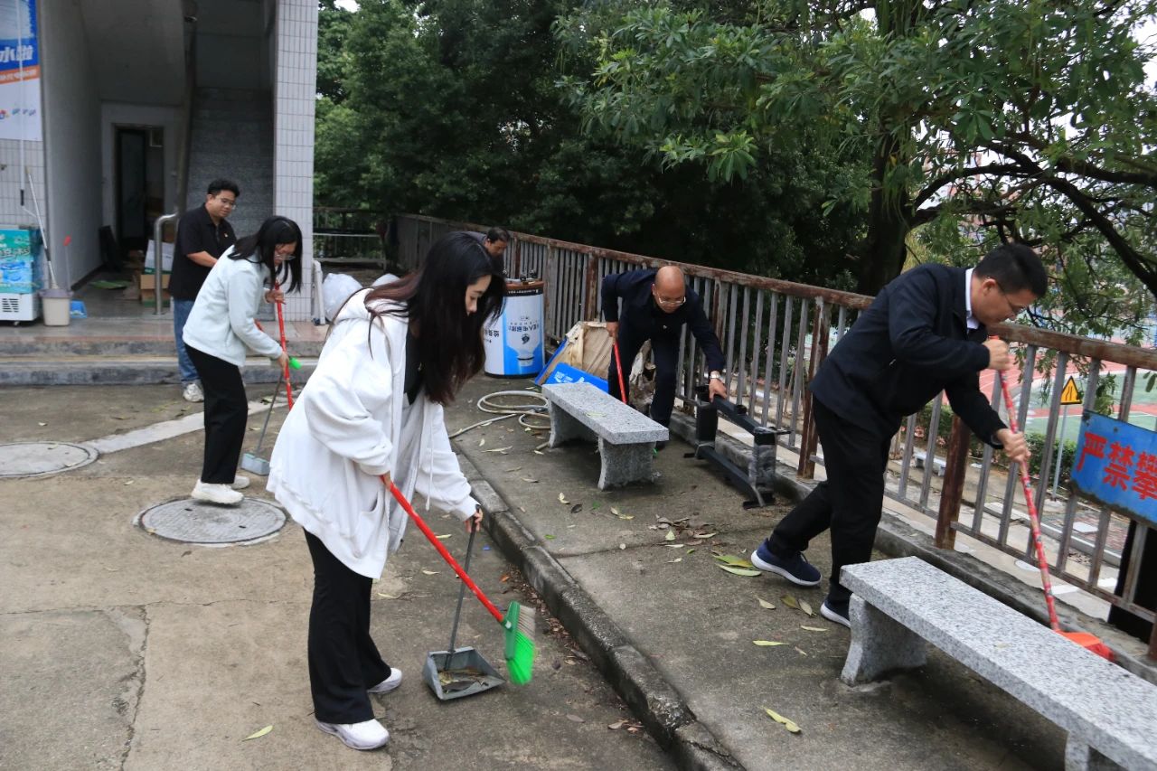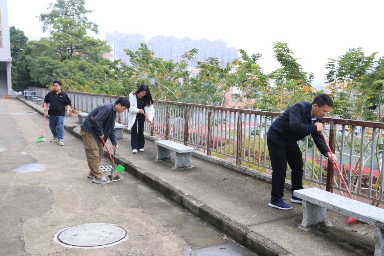 师生党员们分组行动,手持清洁工具深入潮韵广场、文化长廊、教学楼、校道、运动场、食堂、师生宿舍楼等区域,清扫路面落叶、擦拭公共设施、清理卫生死角。劳动过程中,党员师生们分工协作,干劲十足,充分展现了不怕脏、不怕累的奉献精神。经过集中清理,校园环境焕然一新,师生们的劳动成果获得来往师生的频频点赞。