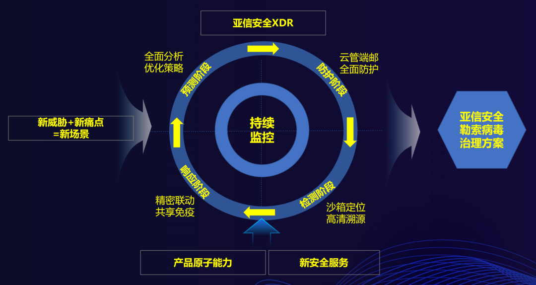 针对这一问题,亚信安全认为,“以身份为基础、以攻防为视角、以联动为策略、以运维为关键、从实战出发”的安全防御思路为基础,通过预先精密编排威胁响应预案,从检测、分析、响应到阻断,全阶段部署安全技术能力,同时强化安全运维效率,在自适应安全架构思路下,建立起勒索治理的全方位的能力。
