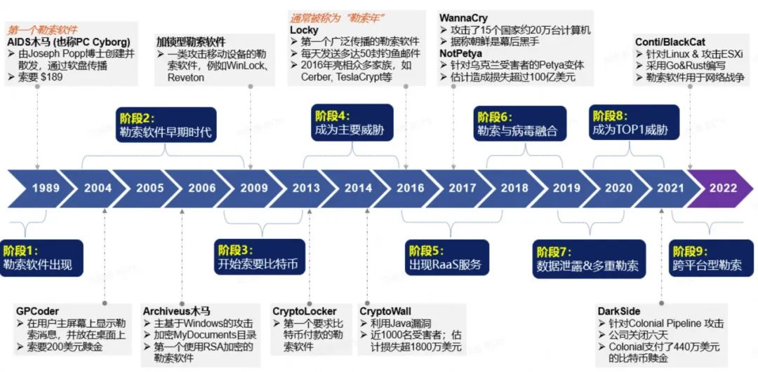 自从1989年第一个勒索软件出现以后,持续在全世界产生巨大的破坏力,从而变得家喻户晓。今天的勒索软件,仍然在快速进化,现在已经发展到了第九个阶段,具有跨平台勒索攻击能力