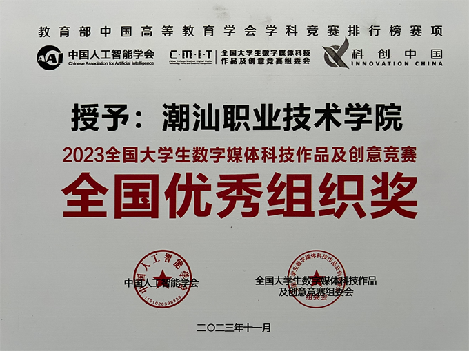 潮汕职业技术学院被评为“全国优秀组织奖”,学校党委书记李育华,副校长、元宇宙产业学院院长颜惠雄被授予“全国突出贡献奖”。