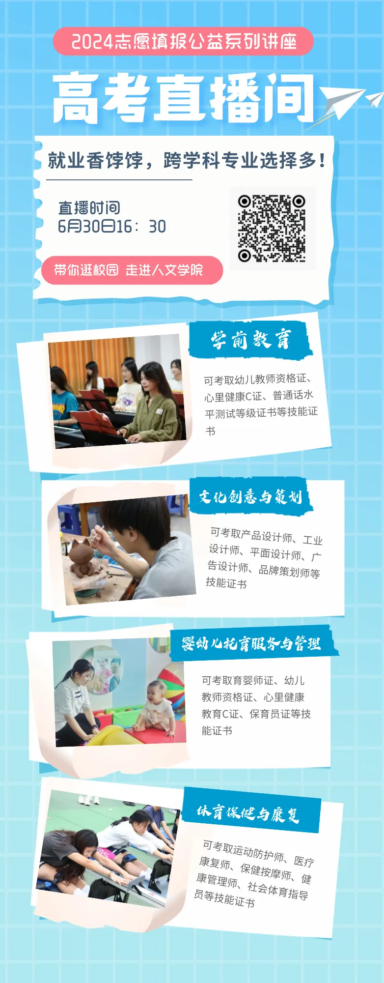 人文学院开设有学前教育、婴幼儿托育服务与管理、文化创意与策划、新增体育保健与康复共四个专业。