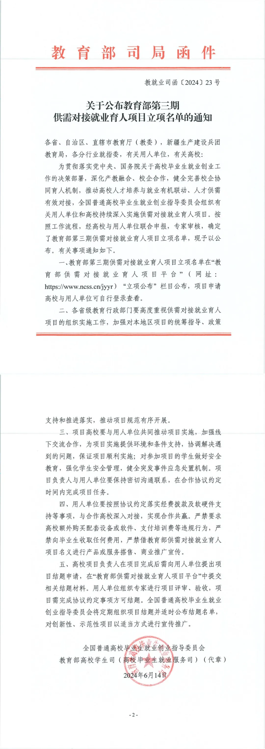 6月14日,教育部高校学生司(高校毕业生就业服务司)发布《关于公布教育部第三期供需对接就业育人项目立项名单的通知》(教就业司函〔2024〕23号),我校林少华老师主持的定向人才培养培训项目获得立项,合作企业为阿里巴巴(中国)网络技术有限公司。