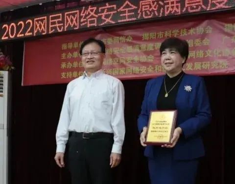 会上,全国网民网络安全感满意度调查活动组委会副秘书长、北京网络空间安全协会流动党员党支部书记黄汝锡说明全国调研活动的目的和意义,以及首站来到揭阳梳理地市先进典型模式的期望,并代表活动组委会为揭阳网络空间安全协会颁发“2021全国网民网络安全感满意度调查活动优秀组织奖”奖牌。